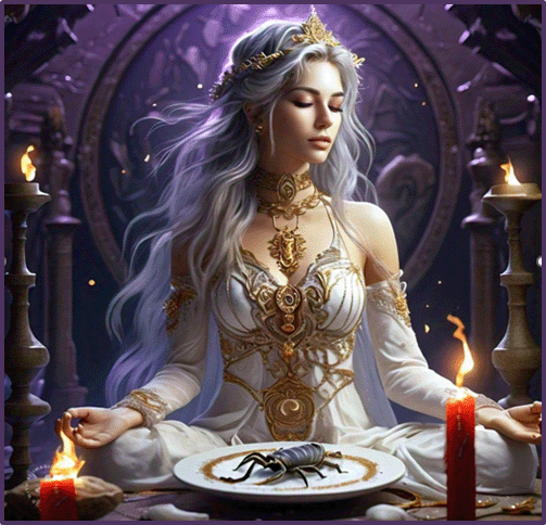 Preparación: En un espacio tranquilo y sagrado, limpiarlo con incienso de salvia, medita en tu corazón unos minutos, en el plato blanco dibuja el símbolo de Escorpión en sal marina, enciende la vela roja conectando con tu corazón y colócalo sobre el símbolo, quema el papel de las emociones en la llama de la vela roja, sintiendo sanación y transformación en el poder del amor. Luego da las gracias. Puedes al terminar botar la sal en la naturaleza.